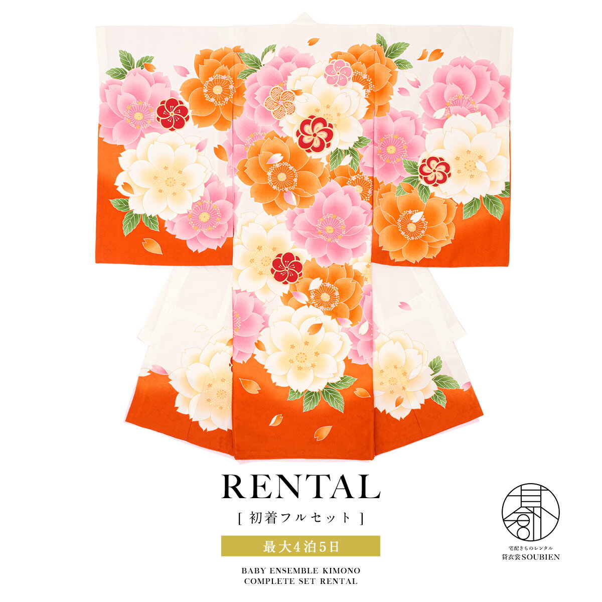 【スーパーSALE限定☆最大3000円クーポン配布中☆】【レンタル】 お宮参り 女の子 レンタル 産着 フルセット 橙色 オレンジ 桜 花 ポリエステル 掛け着 うぶぎ 祝着 記念撮影 赤ちゃん 祝い着 帽子 よだれかけ 創美苑 往復送料無料