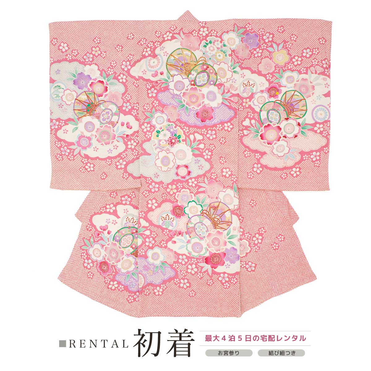 【スーパーSALE限定☆最大3000円クーポン配布中☆】【レンタル】 お宮参り 女の子 レンタル 産着 フルセット 桃色 ピンク 梅 雪輪 手鞠 ポリエステル 掛け着 うぶぎ 祝着 記念撮影 赤ちゃん 祝い着 帽子 よだれかけ 創美苑 往復送料無料
