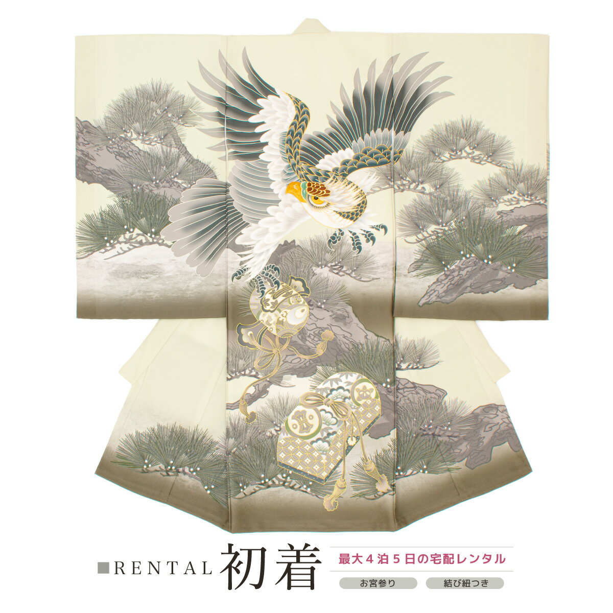 【スーパーSALE限定☆最大3000円クーポン配布中☆】【レンタル】 お宮参り 男の子 レンタル 産着 フルセット ベージュ 茶 鷹 松 通年 掛け着 うぶぎ 祝着 記念撮影 子供着物 産着セット 祝着セット 赤ちゃん 祝い着 帽子 よだれかけ 創美苑 往復送料無料