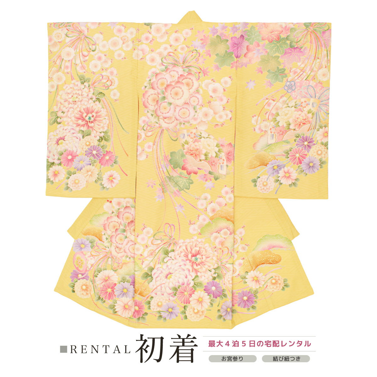 【スーパーSALE限定☆最大3000円クーポン配布中☆】【レンタル】 お宮参り 女の子 レンタル 産着 フルセット 黄色 ライトイエロー 牡丹 桜 梅 菊 花車 手鞠 鈴 女児 掛け着 うぶぎ 祝着 記念撮影 赤ちゃん 祝い着 帽子 よだれかけ 創美苑 往復送料無料
