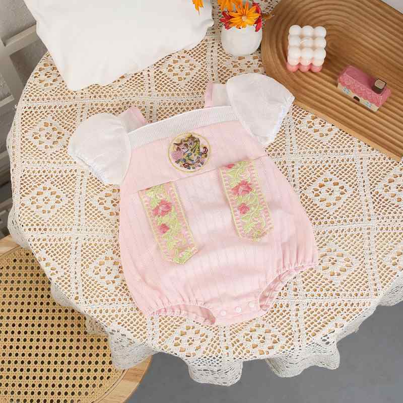 ベビー ロンパース 女の子 男の子 夏 薄手 半袖 カバーオール 綿素材 おしゃれ プルオーバー かわいい 刺繡 花柄 リボン 三角型 お出かけ 普段着 部屋着 1歳 2歳 3歳向け 60 70 80 90cm