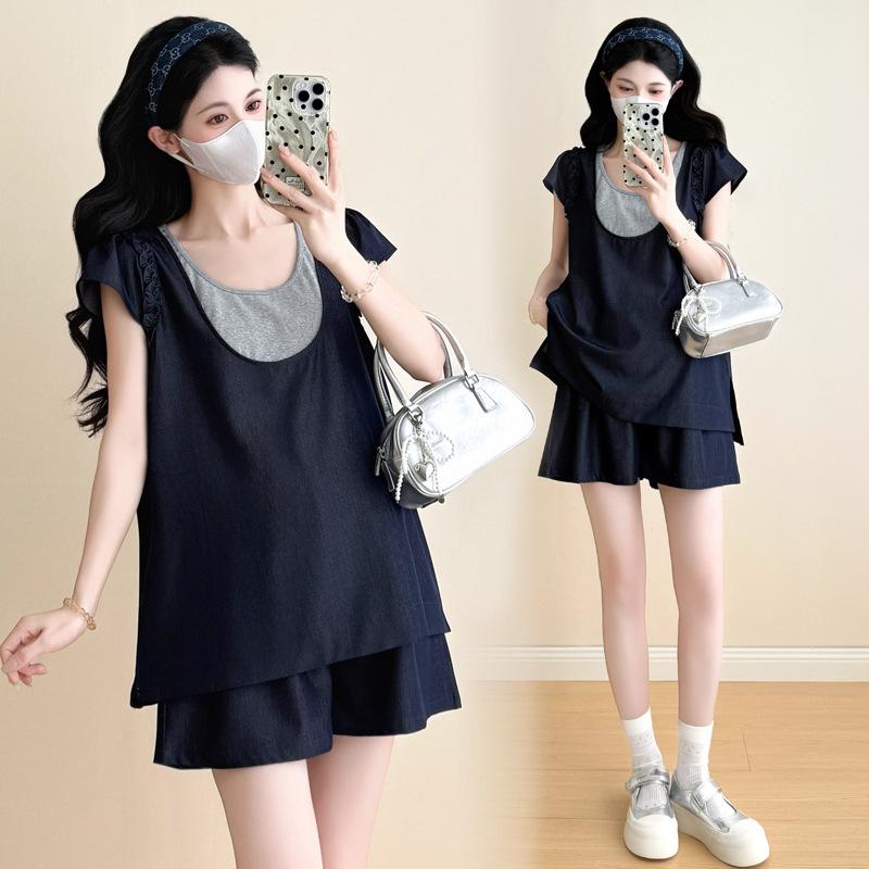 マタニティウェア レディース デニム セットアップ コットン ショートパンツ 2点セット 妊婦服 授乳服 おしゃれ かわいい カジュアル 普段使い 接触冷感 伸縮性 切り替え