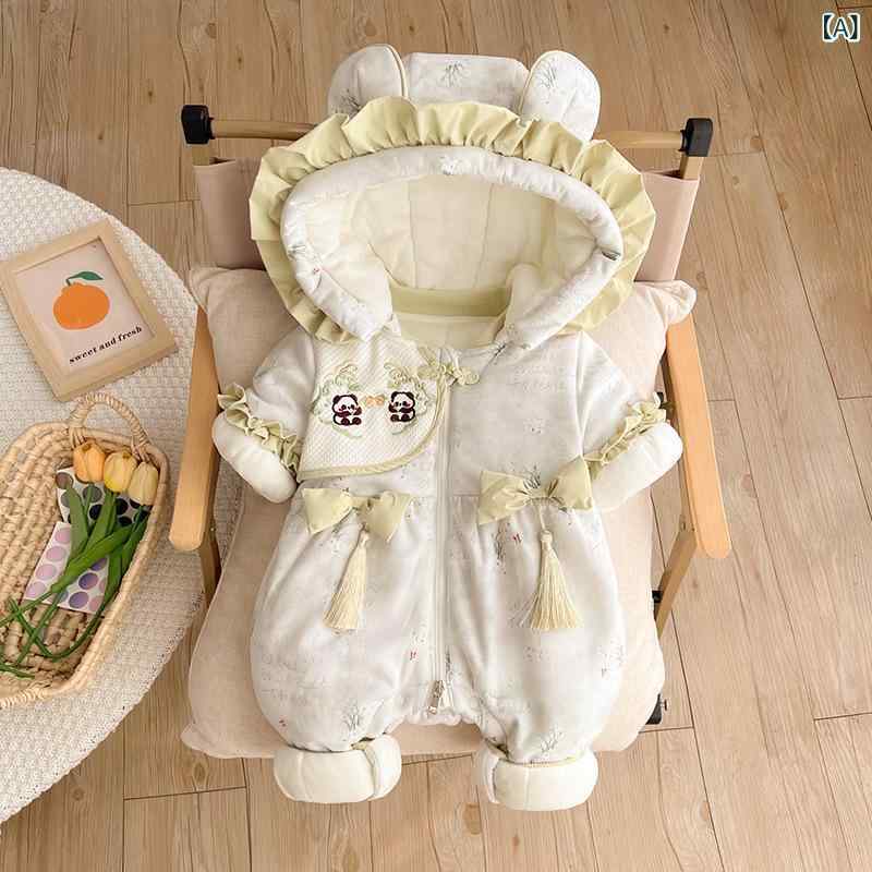 カバーオール 女の子 ベビー 秋冬 かわいい チャイナ風 裏起毛 中綿入り フード付き お出かけ 防寒着 厚手 新生児 0歳 1歳 ライトグリーン