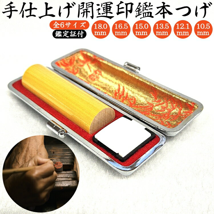 ~上記表は一般例です~ ~印鑑サイズがご不明の方は、お気軽にお問合せ下さい~ 商品発送について ご印鑑はご注文確定から14日程を目安に発送いたします。お急ぎの方は、ご注文前にお問合せ下さい。 なお、長期休暇(GW・夏季休業・年末年始など)は上記の限りではございません。 商品詳細 印材 本つげ最高品 *天然印材の為、色合いや模様は1本1本異なります。 印鑑サイズ 18.0mm×60mm・16.5mm×60mm 15.0mm×60mm・13.5mm×60mm 12.1mm×60mm・10.5mm×60mm 上記6サイズから、当店所定の11通りの組み合わせをご用意。 ※天然素材の為、仕入れ状況により若干の誤差は生じます。 用途 実印・銀行印・認印の他、各種印鑑としてお使い頂けます。 ※当店の開運印鑑性質上、ご購入時に上記3用途をご選択頂きます。 セット内容 個人開運印鑑本つげ最高品2本(11通りの組み合わせから1セット) 青色別珍整理ケース(印鑑ケース2本収納可能) 印鑑ケース2本(牛もみ皮ケース・各サイズ専用) 開運吉相印鑑鑑定書 書体 印相体※当店の開運印鑑は全て接点増画法を用いた印相体です。 <詳しくはこちら(開運印鑑について)> 保証 当店は公益社団法人全日本印章業協会の会員です。 保証内容は同協会が発行する保証書に基づきます。(概要は下記の通り) 個人・法人問わず実印・銀行印のみ、保証期間は5年間。 本体価格5,000円以上(各付属品を除く印鑑本体・彫刻料込)の商品が対象。 その他規定に関しては、商品に同封する保証書をご確認下さい。