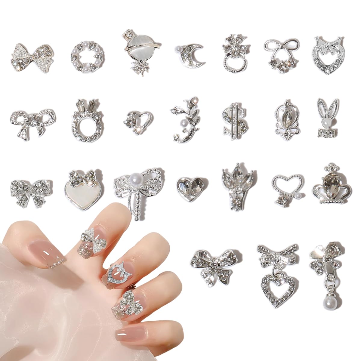 【送料無料】UrbanPulse ネイルパーツ リボン ハート キラキラ 立体 3D 大きめ ネイルパーツセット ネイルアート ジュエリーパーツ DIY 手芸 可愛い シルバー メタルパーツ ( 24個セット) 色:シルバー
