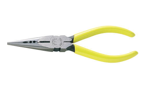 ラジオペンチに割り込み、皮むきなど電気工事に必要な機能を付けました! ・先端が細くなっているため部品の取付や加工ができます。 ・切断刃は刃部焼入れで硬く丈夫にしています。 ・グリップは滑りにくいビニールコーティング。 全長:161mm 頭部幅:17mm 頭部厚:10mm 柄幅:52mm 先端長:50mm 重量:125g 材質(グリップ):塩化ビニール