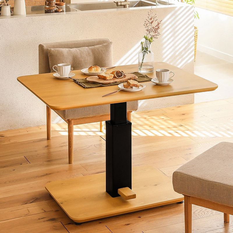 SPECスペック サイズ 本体:幅 105cm × 奥行き 75cm × 高さ 56cm〜71cm天板厚:2.5cm 床から天板下までの高さ:53.5〜68.5cm台座からヒーターまでの高さ:38.5〜53.5cmハロゲン管ヒーター:幅 78cm × 奥行き 9.5cm × 高さ 9.5cm【梱包サイズ】幅 113cm × 奥行き 83cm × 高さ 11cm幅 78cm × 奥行き 57cm × 高さ 54cm カラー ナチュラル ウォールナット 素材 天板:オーク突板(ナチュラル)、ウォールナット突板(ウォールナット)ウレタン樹脂塗装脚部:スチール、フレーム植毛塗装 耐荷重 約 15kg 備考 本体重量:39kg梱包重量:44.5kg組立品(組み立て時間:2名で10分程度)付属工具:六角レンチ必要工具:なし日本製ハロゲン管ヒーター 180W×2灯(MHL-361ET)手元電子コントローラー付き (3時間OFFタイマー)こたつ布団はご使用いただけません。ダイニングチェアなどは別売りです。 こちらの商品は、タイプ展開がございます。下記リンクより、他タイプのページをご覧いただけます。 USBポートシェルフセットはこちら USBコンセントBOXセットはこちら カテゴリー:ダイニングテーブル/即日出荷可能アイテム高さが変わると家族が喜ぶ食卓に。コンパクトな昇降式ダイニングテーブルダイニングテーブルのサイズは普通、大人を基準に作られています。チェアに座った時のテーブルとの差尺(テーブルの天板までの高さと、椅子の座面までの高さの差)ももちろん、大人に合わせた設計。ですが、実際は子どもだって大人と同じく食事をしますよね。少し大きくなってくると、大人と一緒にダイニングに座りたがりますが、テーブルの高さが合わなくてこぼしたり汚したり、うまく食べられずにグズグズと...。「昇降式ダイニングこたつ Force2 幅105cmタイプ」は天板の高さが変えられるダイニングテーブル。高さ56cm?71cmまで調整ができます。テーブルを下げて、チェアに座った子どもの高さにぴったりと合わせると、子どももご機嫌に。大人はその低さに合わせて座るわけですが、天板が下がった分視界が広がって、案外リラックスできます。105cmタイプは2?3人で使うのにちょうどよいサイズ感で、スペースも取らず、コンパクトなダイニングにも無理なく置くことができます。子どもが寝静まったら、サッと高さを上げて大人仕様に。小さな照明を置いて読書をしたり、ホッと大人の晩酌タイムを楽しみましょう。ひとつ気になるのは、見た目の問題。機能性が上がると、作りはメカニックになります。Force2もそこは否めないですが、木目を活かした突板を広く使ったり、機械部分はブラックで統一されていたりと、お部屋の印象を損ねない配慮がされています。また、昇降はとても簡単で、ペダルを踏んで天板を上下させるだけ。ペダルも木目と色を合わせていますので、見た目の問題は気にならないかと思います。無段階調整で、食事以外のシーンにもしっかりとフィット昇降機能があると、思った以上に便利で、食事以外でも暮らしが豊かになります。例えばPC作業をする時は、テーブルとチェアの差尺は25cmくらいが理想。また、書き仕事の時は30cmくらいが最適です。長時間同じ作業をしていると、このちょっとした差で作業効率が上がったりパフォーマンスが下がったりしますから、高さの微調整は無下にはできません。ちょっと横になってくつろぐときは、ソファーより少し高いくらいの位置に。楽な姿勢のままお菓子をつまんだりドリンクを飲んだり、食後のグータラ時間が更に快適に。Force2は無段階で15cm、しかも軽い力で昇降しますから、ここしかない!という絶妙な高さに簡単フィット。シーンに合わせてお好みの高さでお使いください。ダイニングでもこたつの温かさを。布団いらずのヒーター付きテーブル昇降機能だけではありません。実はこのテーブル、天板裏に「輻射(ふくしゃ)式」のヒーターが付いており、足元をじんわり温めてくれるのです。輻射式暖房の特徴は、太陽の光のように温かい赤外線の熱が出て、あたっているところをじんわりと温めることで、体が芯からポカポカになります。また、空気の対流が少なくホコリが舞わないので、食事をするダイニングにぴったり。アレルギー体質や空気に敏感な方にも優しいヒーターです。さらに、空気に熱エネルギーを奪われることもないので、こたつ布団が不要。布団を汚してしまう心配もせずに、食事を楽しむことができます。これで、エアコンを付けていても足元が温まらない、肌寒い季節のダイニングでも、エアコンとは別でヒーターを用意する必要がなくなります。ヒーターは取り外しが可能。付けたままでも邪魔になるものではありませんが、使わない季節は外しておけば、足元がよりスッキリと、広々快適に過ごせます。選べるオプションは2タイプ。ダイニングはさらにくつろぎの場所に。さらに、パソコンやスマートフォンなどを充電できる2タイプのオプションもご用意しています。 こちらは、USBポート1口とコンセント2口がついたコンパクトな「USBコンセントBOX」。 USBポートにはホコリ防止のカバーが付い