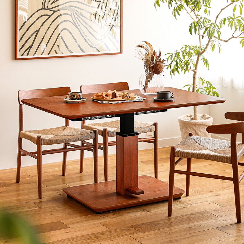SPECスペック サイズ 本体:幅 130cm × 奥行き 80cm × 高さ 56cm〜71cm天板厚:2.5cm床から天板下までの高さ:53.5〜68.5cm台座からヒーターまでの高さ:38.5〜53.5cmハロゲン管ヒーター:幅 78cm × 奥行き 9.5cm × 高さ 9.5cm【梱包サイズ】幅 136cm × 奥行き 87cm × 高さ 7cm幅 83cm × 奥行き 63cm × 高さ 56cm カラー ナチュラル ミッドブラウン ヴィンテージレッド 素材 天板:天然木オーク化粧繊維板(ウレタン塗装)脚部:スチール、フィルム(塩化ビニル系樹脂) 備考 本体重量:47kg梱包重量:54kg組立品(組み立て時間:2名で10分程度)付属工具:六角レンチ必要工具:なし日本製ハロゲン管ヒーター 180W×2灯(MHL-361ET)手元電子コントローラー付き (3時間OFFタイマー)こたつ布団はご使用いただけません。ダイニングチェアなどは別売りです。 こちらの商品は、タイプ展開がございます。下記リンクより、他タイプのページをご覧いただけます。 USBポートシェルフセットはこちら USBコンセントBOXセットはこちら カテゴリー:ダイニングテーブル/即日出荷可能アイテム食事にも、勉強にも、仕事にも。高さを変えられる「昇降式こたつダイニングテーブル」ダイニングテーブルは、家族みんなが使うもの。わいわいと食事をしたり、子どもが宿題をしたり、時には映画を観ながら晩酌したり...。それぞれの目的によって、使い心地のよい高さは変わるものです。そこでおすすめなのが、天板の高さが変えられるダイニングテーブル「昇降式ダイニングこたつ Force2(フォースツー) 幅130cmタイプ」。こちらは、高さ56cm?71cmまでの調整が可能です。日中は、ソファー前のローテーブルのような使い方やデスクとしての役割を。食事の際には、子どもの高さに合わせたダイニングテーブルとして。シーンに合わせて使うことができます。昇降機能があると、思った以上に便利で、食事のシーン以外でも暮らしを豊かにしてくれます。例えばPC作業をする時は、テーブルとチェアの差尺は25cmくらいが理想。また書き仕事の時には、30cmくらいが最適です。長時間同じ作業をしていると、このちょっとした差で作業効率が上がったりパフォーマンスが下がったりするので、高さの微調整は無下にはできません。ちょっと横になってくつろぐときは、ソファーより少し高いくらいの位置に。楽な姿勢のままお菓子をつまんだりドリンクを飲んだり、食後のグータラ時間をさらに快適にしてくれます。force2 幅130cmタイプは、無段階で15cmの調整が可能です。しかもペダルを踏んで天板を上下させるだけの軽い力で昇降できるので、ここしかない!という絶妙な高さに、簡単フィット。シーンに合わせて、お好みの高さでお使いいただけます。「ダイニングテーブル」として、美しく。機能に伴うメカニック感を軽減しました。force2 幅130cmタイプは、昇降式・こたつという十分な機能を持ちながら、ダイニングの主役としても満足なデザイン。インテリアとしての見心地と快適な過ごし心地の2つを同時に叶えてくれるダイニングテーブルに仕上がっています。その見心地を実現しているのは、「支柱」と「天板」。まずは、「支柱」について、紐解いていきます。昇降式のテーブルでよくあるのが、メカニックなデザイン。機能性を重視すると、どうしてもメカニックな作りになるのは仕方のないことです。しかし、インテリアを楽しむにあたって、見た目も妥協したくないところ...。そこでForce2 幅130cmタイプは、昇降可能なスチールの支柱を、天板に合わせた木目のフィルムでカバーリングしました。このカバーリングにより、気になるメカニック性が大幅に軽減され、まるで木製テーブルのような仕上がりに。機能性が備わったテーブルとは思えないほどの温かみのある雰囲気を作り出しています。「節あり突板」と「無垢オーク」で、ダイニングの顔になる美しい天板デザインさらに、force2 幅130cmタイプの見心地のこだわりは、「天板」にも。それは、節ありのオーク材突板を採用していることです。突板とは、木を薄くスライスしたもの。この突板を天板表面に貼りつけることで、無垢の木のような意匠を得ることができます。今回採用したのは、突板の中でも珍しい「節あり」。節は木の枝の根元部分で、木材としては穴が開いた美しくないという理由で、昔は捨てられてきた部分です。しかし、近年は、節の荒々しさが魅力的だという見方が家具業界でも広がり、人気を博しているのです。節を薄くスライスするというのは、実はあまり見かけないもの。協力工場の技術力により、無垢テーブルと見まがうような意匠に仕上げることができました。force2 幅130cmには、こたつ機能がついています。こたつは天板にも熱が加わるために、無垢の天板は反りや割れが出る可能性が高く使えません。その中で、無垢と見まがうような節あり天板を実現できたのは、「ナチュラルヴィンテージ」の世界観を追求するリセノならでは。機能性を損なうことなく、インテリアに溶け込む美しさを生み出しています。さら