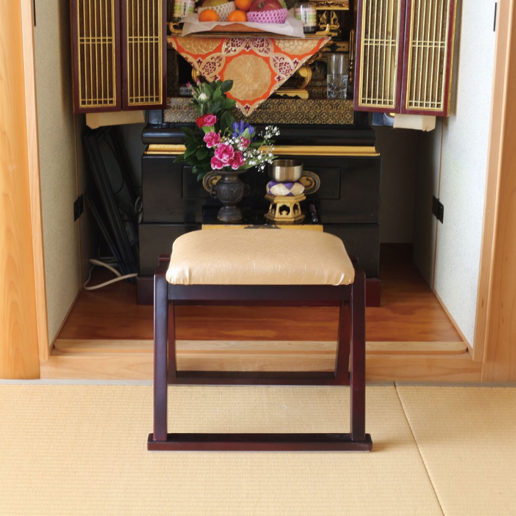 SPEC サイズ:約幅43cm×奥行34cm×高さ37.5cm 重量:約2.1kg 材質:天然木パイン材(本体)、ポリウレタン・ウレタンフォーム(座面) 表面加工:ラッカー塗装 生産国:中国\天然木パイン材/ スタッキングできる仏壇前椅子 積み重ね収納が可能! 仏壇前の椅子として大活躍!天然木パイン材で、軽くて女性の方でもラクに持ち運べます。 脚部裏側にはキズを付けにくいクッションシート付