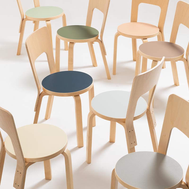 Chair66の魅力は その可愛らしさだと思う アルテックのチェアと聞いて、まず頭に浮かぶのはチェア66だと思います。フィンランド国内でもさまざまな場所で使われているため、目にする機会も多いですし、チェア69より個性的だから、どこにあっても一目でアルテックのチェアだとわかります。まさに、北欧、フィンランドを感じるチェア、丸い座面も可愛らしく、円形テーブルやスツール60との併用にもバッチリです。背面には厚さ12mmほどのフィンランド産バーチの合板が取り付けられており、面積も広いので背中が当たって痛いこともなく、適度にしなるところも特徴のひとつです。背板は広いのですが厚くはないので、片手で持てるぐらいの重さですし、大きく穴の空いたデザインが採用されているからか、持ち運びにも便利です。そんな特徴が溢れるチェア66なのですが、魅力は何よりもその可愛らしさだと思います。その可愛らしいシンプルなチェアに、カラフルなリノリウムを採用することで、さらに魅力が増しに増していると感じています。とても組み立てが大変な椅子でもありますが、スコープでは無料で組み立て、お届けします。 写真上 : ウォールナット 32 / 写真下 : Chair66 クレイ 30、Stool60 パール 1、Chair66 ウォールナット 32 スコープハウス用チェア Chair66のリノリウム 2025年はスコープ25周年、これから家具のラインナップを充実させたいと考えていたら、家具を充実させるなら場所がいる、実際に設置して使用するための新たな場所がいる。そうか、つまり家が必要なんだ!家を建てよう!そう思考は急展開し、新たなス的なる生活を試す場所であり、撮影スペースでもある、スコープハウスを建て始めてしまい、それはスコープ25周年にあたる2025年夏に完成します。そこで使うダイニングセットはアルテック、チェアは新しいチェアを取り入れたかったので、ようやくチェア66がスコープに登場することとなりました。チェア66なら、僕の好きなリノリウム座面も可能だし、リノリウム座面のスツール60と併用すればとても素敵なダイニングになる!そう確信し、家のプランが決まるより早く、リノリウム座面のチェア66をアルテックへオーダーしていました。アルテックのチェアで一番お手頃なのは、チェア66ナチュラル ラッカーとチェア69ナチュラル ラッカー、64,900円です。チェア66のリノリウム座面はブラックのみ定番にラインナップされていますが、72,600円と少し価格がアップします。そこで、スツール60と同じようにスコープが別注した8色のリノリウム座面のチェア66については、ナチュラル ラッカーと同額64,900円にしました。カラーバリエーションはドロップリーフテーブルに使われている6色+人気色のパールとぺブルを加えた計8色です。スコープハウスではヴェイパーとスモーキーブルーのチェア66を使う予定です。 写真上 : Chair66 ペブル 11、Stool60 ペブル 11、Chair66 パール 1、Stool60 パール 1 / 写真下 : オリーブ20、ピスタチオ 22 Chair 66 直径37.5cm Stool 60 直径35cm スツール60の座面とチェア66の座面は共通だと思っていたのですが、それは間違い、共通ではありません。チェア66の座面のほうが直径で2.5cm大きいです。チェア66は背があるため、少し浅く座ることになるので、スツールより座面が大きくなければ座りにくいのだと、使って理解しました。ダイニングチェアと同じ色のスツール60を併用すると、同じ色なんだけどサイズが違って、良い見え方をします。また、ツートンカラーのドロップリーフテーブル DL81Cのカラーと揃えると、当然ですが綺麗にまとまります。ただ、リノリウムは使っていると日に焼けて少しずつ色が変化しますし、そもそも生産ロットにより色ブレもあるので、同じ色で揃えても多少の誤差が生まれるのは仕方がありません。 オイバ先生の家のダイニングチェア オイバ先生の家のダイニングチェアはChair66のナチュラル ラッカーでした。テーブルはアルテックではなく、とても素朴なテーブル、そこには石本先生のテキスタイルがテーブルクロスとして掛けられていました。テーブルは小振り、大きな男たちがその小さなテーブルを囲み、食事をしたりお酒を飲んだり、とても楽しい時間を過ごした、思い出深いスペースです。スコープではチェア66の取り扱いをしていなかったのですが、スコープハウスで使う家具として新たな椅子をと思った時、オイバ先生のダイニングが頭に浮かび、椅子はチェア66にしようと即決しました。コンパクトなチェアですが、大きな人でも長く愛用できることをオイバ先生が実証してくれていますから。 スペック 材質 バーチ (ラッカー塗装) 座板表面材:リノリウム 寸法 約W390×D445×H780mm / シート高 440mm / 座板φ375×T29mm / 約4.8kg 生産 Made in Finland 備考 組み立て不要 完成品 購入前に確認ください ・ 座板側面に見られるライン状の修正跡は良品としています。 ・ 後脚と座板の接合部分を上から見た際、後脚上部の平面がわずかに見えている場合があります