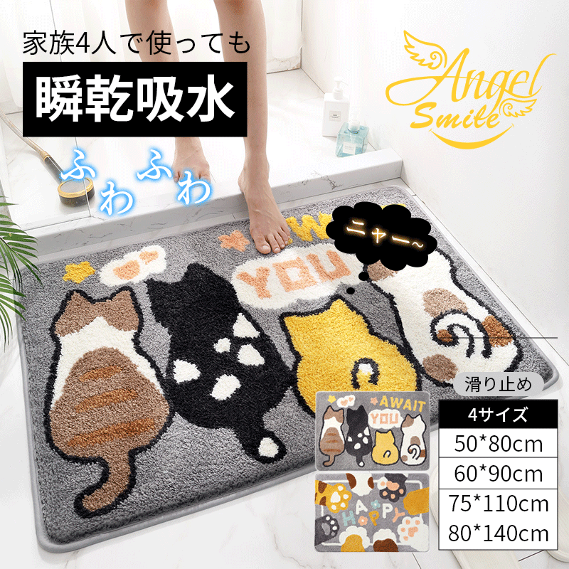 バスマット 速乾 お風呂マット 足拭きマット 玄関マット 室内 ラグマット 絨毯 じゅうたん 小さめ 地垫 カーペット おしゃれ 猫柄 可愛い 吸水 床保護 防音 洗える 滑り止め 人気 厚い 耐磨耗性 屋内 バスルーム キッチン リビングルームで使用できます オールシーズン適用 玄関マット 屋外 室内 猫柄 可愛い ふわふわ もこもこ オシャレ 水洗える 滑り止め 泥落と 耐磨耗性 し カーペット 屋内、屋外、玄関、寝室、廊下、洗面台 【ご注意ください】 ※手測りですので、多少の誤差があるかもしれません。洗えるマット:汚れたマットは掃除機で吸っても毛の中にまで入り込んだ砂がなかなか取れなかったのですが、 洗濯機で洗うとキレイになります。自宅で洗濯できるので、いつでも清潔的に、使いやすいです。柔軟性素材、ふわふわ肌触り:表側にポリエステル繊維織物で作られた濃密で毛足のマットで、フワフワとした踏み心地が気持ち良くてやみつきになる肌触り! 水をすばやく吸収、気持ちよく使用できます。滑り防止加工:マット裏面は防滑加工がされているので、お年寄りやお子様やペットや奥様が走り回ったり、室内の転倒が防止できます 。床暖房、ホットカーペット対応なので、寒い季節でもさらに暖かく快適にご使用いただけます。使用場所:玄関、キッチン、洗面所、お風呂、床暖房、部屋、台所、会議室、リビングルーム、ホ ール、寝室、書斎、屋外、バスルーム、ダイニングルーム、廊下にも幅広く活躍できるアイテムです。機能:柔軟性、吸水性、速乾性、耐磨耗性、滑り止め、泥とし、抗菌防臭加工、折りたたみ可能 详细描述: 5