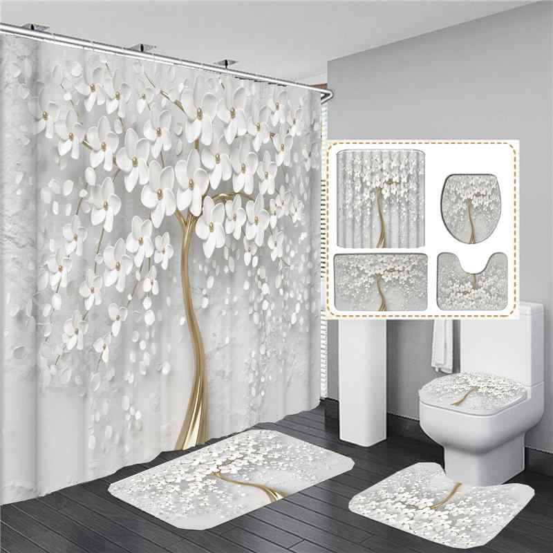 カーテン 浴室 レディース 花柄 3D エレガント スタイル ポリエステル シャワー カーテン バスマット トイレマット 4点セット ヨーロッパ風(x2)