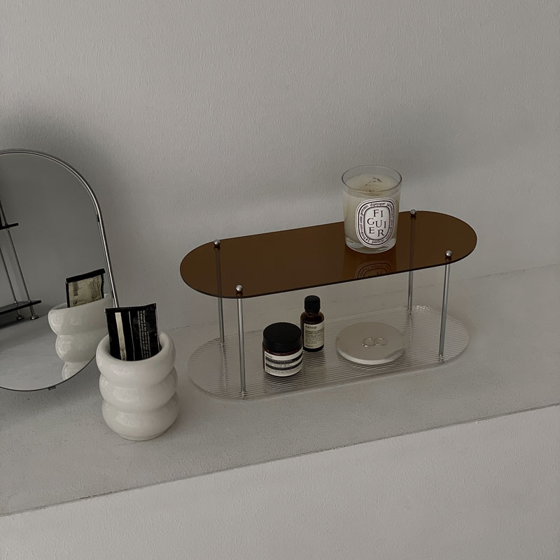 アクリルの2段ディスプレイラックです。 細身のスチール脚とシンプルカラーのデザインが、飾るアイテムの魅力を引き立てます。 波のような模様が印象的なクリア板との組み合わせでクリアブラウン、クリームの2カラーからお選びいただけます。 こちらは簡単な組み立て式になります。 保護シートが付いておりますのでご使用前に剥がしてからご使用ください。 ※製造工程上、素材の箇所に小さな傷がある場合がございます。使用上の問題がない為、販売するお品はすべて良品となりますので、予めご了承の上お買い求めください。 ■素材 アクリル スチール ■サイズ 幅約40cm×高さ約16cm×奥行約14.5cm ※他のアイテム含め、荷物のサイズが変わる数量をお買い上げの場合に限り、送料変更がありますので別途ご連絡致します。