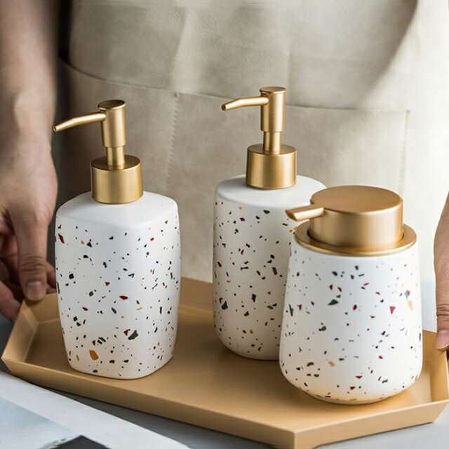 セラミックにテラゾー柄をプリントしたソープディスペンサー。 マットな質感とゴールドのノズルがアクセントになり空間に置くだけで雰囲気がグッと上がります。 市販のソープなどを詰め替えてご使用ください。ストレートタイプになります。(※泡タイプではありません) ■素材 セラミック ■サイズ A:幅約7cm×高さ約18cm×容量:380ml B:幅約7cm×高さ約17.5cm×容量:370ml C:幅約9cm×高さ約12.5cm×容量:400ml ※他のアイテム含め、荷物のサイズが変わる数量をお買い上げの場合に限り、送料変更がありますので別途ご連絡致します。