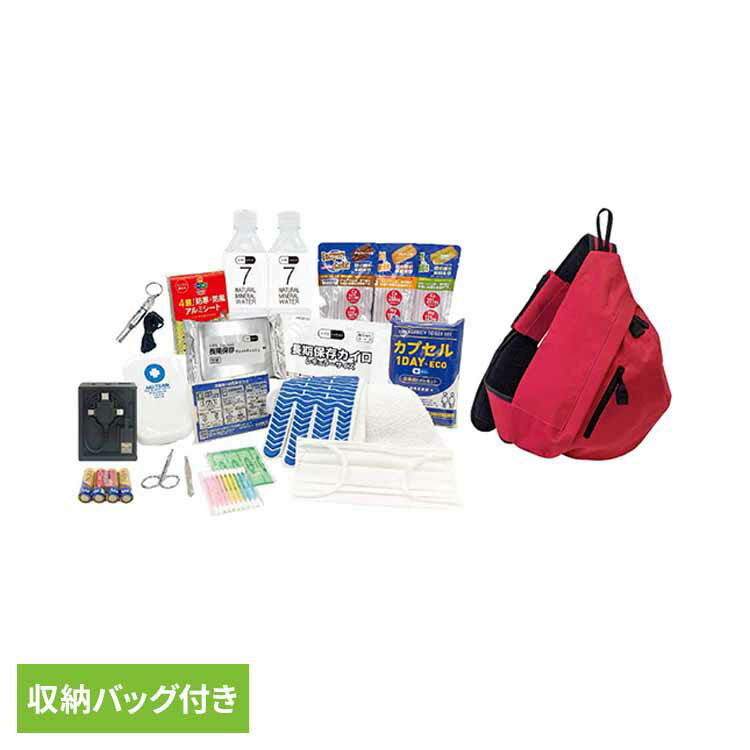 帰宅困難者が徒歩帰宅する際に必要なアイテムを厳選したセット。【セット内容】ワンショルダーバッグ×1個簡易救急セット×1セットスベリ止め手袋×1双タオル(ビニール入り)×1枚非常用カイロ×1個ポケットティッシュ防災タイプ×1個ウェットティッシュ×1個アルミブランケット×1枚保存水500ml×2本エマージェンシークッキー×3食(チョコ、プレーン、抹茶)簡易トイレ5回分×1個ホイッスル×1個マスク(個包装)×1枚マルチ充電LEDライト×1個単三電池×4本●商品サイズ(cm)幅約27×奥行約25×高さ約40●商品重量約2.5kg(検索用:防災セット 避難セット 保存水 クッキー 備蓄 災害時 オフィス 4580225031141)最強翌日配送対象商品に関するご案内 最強翌日配送対象商品・対象地域に該当する場合は最強翌日配送マークがご注文カゴ近くに表示されます。 最強翌日配送可能なお支払方法は【クレジットカード、代金引換、全額ポイント支払い】のみとなります。 下記の場合は最強翌日配送対象外となります。 ・15点以上ご購入いただいた場合 ・時間指定がある場合 ・ご注文時備考欄にご記入がある場合 ・決済処理にお時間を頂戴する場合 ・郵便番号や住所に誤りがある場合 ・最強翌日配送対象外の商品とご一緒にご注文いただいた場合 ・お届け先住所文字数が40文字以上の場合ご注文前のよくある質問についてご確認下さい[ FAQ ]