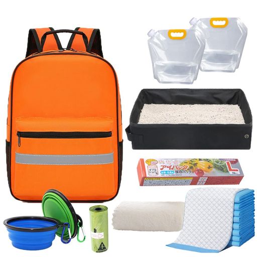【ペットを守る防災用品がこれ一つで準備万端】環境省「人とペットの災害対策ガイドライン」を元に、防災士とペットを愛する社員が犬猫に必要なグッズを厳選された防災セット。 【セット内容】防災リュック、折りたたみ食器(2点)、便利なチャック付き袋(10枚)、ペットシート(8枚)、うんち袋(15枚)、水入れ袋(2点)、ポータブルトイレ、タオル 【非常持出し袋】目につきやすい高発色の蛍光カラー生地を使用し、高い視認性を確保。前面と肩ベルトにも反射材付きで多方向からの照明を反射し、夜間の避難を安全に。防水・防汚素材で雨天時でも雨水の浸入を防止。 【小物を収納できる便利なポケット付き】バッグの内側と外側に5つポケットが付いているので、ペットの薬やおもちゃ、飼い主様のスマートフォンなど小物を収納に便利。 【リュックと手持ちの便利な2way仕様で持ち運び】両手が空くので避難の際も安全。緊急時にさっと持ち出せるよう、玄関やリビングに置いて安心。普段のペットとのお出かけでも使える。