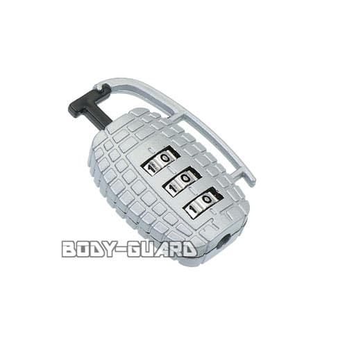 商品説明使用する錠にも遊び心を!手りゅう弾を模したユニークな形のダイヤルロックです。鍵を使用しないので紛失の心配なし!またカラビナタイプなので、旅行バッグなどに装着出来きます。 サイズ全長約4.5cm 幅約3cm 厚さ約1cm 重量 約16g ※目安です カラー シルバー 素材合金 番号変更方法※初期設定値は「000」です(1)本体底部分にある黒いボタンをボールペンや細い棒で押します。(2)押した状態のまま、ダイヤルを回し3桁のお好みの番号を設定します。(3)お好みの番号を設定したら、ボタンから外します。 その他※ロットにより、商品仕様が変わる場合があります※使用する際は開錠番号に合わせた状態で、上部の黒い部分を真下に押してください。※上部の黒い部分を回転させようとしないでください コメント旅行時の盗難防止にお勧めです♪また鍵紛失の心配がないのでとても安心です!