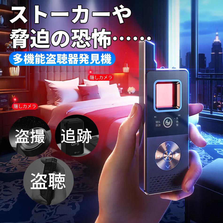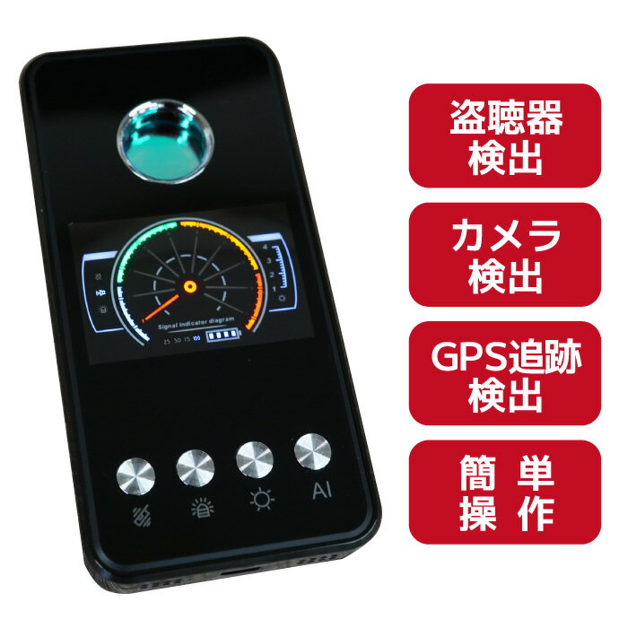 盗聴盗撮発見器は、電波感知、磁気探知、レーザー探知の3つの機能を備え、GPS追跡装置や発信器も検出可能です。アメリカの軍事技術を活用し、1MHzから8000MHzまでの広範囲な信号をカバーします。操作は非常に簡単で、電波、Wifi不使用ですので、データが外部に流出する心配もありません。コンパクトなデザインで、自宅や旅行先でも安心してプライバシーを守ることができます。製品機能紹介概要電源を入れると自動で「電波感知モード」に入り、1MHz〜8000MHzの無線電波を検出します。スマホやWi-Fiなどの一般的な信号にも反応します。盗聴器/盗撮カメラ/GPS追跡装置などの発見に有効です。操作と表示本体の数字表示の下にあるマークの点灯で動作確認ができます。検知時はライトや振動でお知らせします(通知方法は切替可)。ボタン/スイッチ別の機能説明右端ボタン — 感知感度調整電波の感知強度(感度)を調整できます。用途に合わせて微調整してください。右端ボタン(AI表示) — 強電波カウント機能「AI」機能は強い電波を検知した回数をカウントします。電波を断続的に発射するタイプ(盗聴器・盗撮器・GPS等)を効果的に検出できます。右から2番目のボタン(太陽のようなアイコン) — 光学式レンズ探知特殊フィルター+点滅LEDライトでカメラレンズの反射を見つけます。盗撮用カメラのレンズ検出に特化。点滅パターンは4種類で、本体右側の数字表示にて確認可能。右から3番目のスイッチ — 磁気(磁界)探知(プローブ装着時)付属の磁気プローブを使用すると、磁石で固定されたGPS発信器やボイスレコーダーを探せます。車両内に設置されたAirTag等の追跡デバイス発見に適しています。反応時はライトが点灯。右から4番目のスイッチ — 通知モード選択音またはバイブレーションでのお知らせを選択可能。環境に合わせて切替できます。使い方の簡単な手順電源オン → 自動で電波感知モードへ。感度を右端ボタンで調整。不審箇所をスキャン → 強信号は「AIカウント」で確認。カメラを探すときは光学式探知機能を使用。車や金属部分は磁気プローブを装着してスキャン。通知方法を音/バイブから選択。