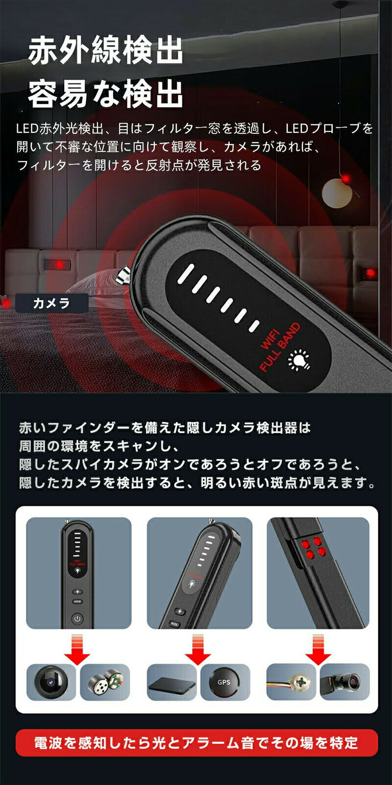 盗聴器 発見器 盗聴 盗撮 GPS 発見機 小型 盗聴器発見機 隠しカメラ 盗聴防止 盗撮防止 探知機 赤外線視認 RF電波検知 WiFi電波検知 高感度 電波探知 遠隔盗聴器 探知 防犯 スマホ盗聴防止 尾行防止 レーザースキャン 女性自宅 公衆トイレ ホテル