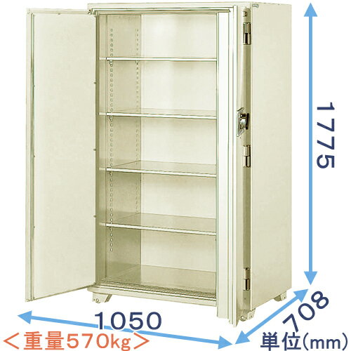 特長 ●火災発生から1時間守る耐火性能 建物火災を想定した試験を行ないます。加熱試験炉で火災発生の0℃から加熱し、1時間後には927℃に達しますが、金庫内は177℃以下(紙が薄っすら焦げる手前)に保たれています。●100万変換ダイヤル・高性能な100万変換ダイヤル 扉裏面のダイヤルボックスにて機械的にダイヤル番号を変換することができます。100万通りの番号合せによる金庫破りは不可能に近いです。・故障が少なく寿命が長い、信頼の錠前 機械的構造の錠前のため、電子ロックに比べ部品寿命が長いのが特長です。 商品仕様 耐火性能:一般紙用1時間耐火性能ロックシステム:100万変換ダイヤル式外寸:W2,168×D1,256×H2,227(mm)内寸:W1,920×D920×H2,035.8(mm)質量:1,050kg内容積:4,070L付属品:室内照明、扉ストッパー、搬入出用スロープ※受注生産商品■ この金庫は、専門業者による【搬入設置必須】(有料・別途見積り)が必要となります。 ■ 設置料をお見積りさせていただきますので、以下についてご連絡ください。 ●ご検討中の金庫(メーカー名・品番) ●お届け先のご住所(番地以下は結構です) ●一戸建て or マンション or ビル or その他(具体的に) ●設置階数(何階に設置するのか)、エレベータの有無 ●道路から2段以上の段差がある場合は、箇所数と段差数 ●ご連絡先(日中ご連絡が取りやすいもの)