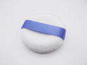 【日本製・数量限定】フェイスパウダー用パフ 直径約55mm材質:ポリエステル 毛足3mm生地色:白 リボン色:ブルー (D-10)化粧 メイク パフ パウダー パウダーパフ フェイス ルース 靴磨き メンズ メンズコスメ 男性化粧品 化粧用具 OEM 製造 東京パフ