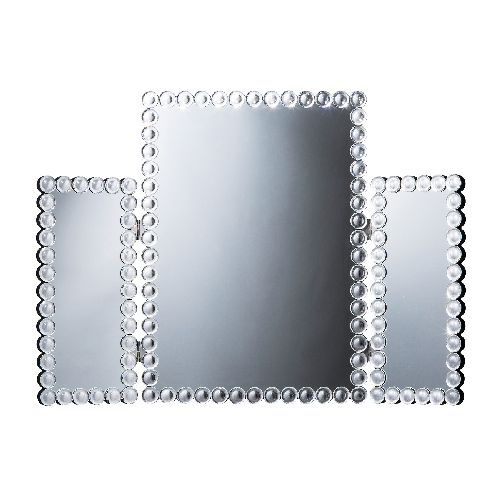 【代引不可商品】【北海道・沖縄・離島配送不可商品】仕入先よりお客様宅へ直送手配いたします商品です。そのため代引きは対応しかねます。また北海道・沖縄・離島へのお届けは対応しかねます。予めご了承くださいませ。【完成品としてお届けします】■クリスタル調の装飾が豪華。■三面鏡はさまざまな角度からの身だしなみチェックに便利。83011仕様:完成品プラスドライバー:×材質:4mm厚ミラー(面取り)、中質繊維板商品サイズ:W78×H54×厚さ2cm商品重量_Kg:7Kgクリスタル調の装飾が豪華