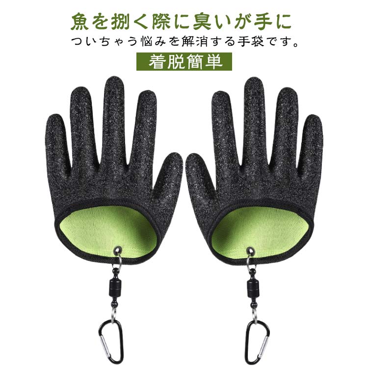 フィッシンググローブ 手袋 両手 左右セット 釣り フィッシング 魚つかみ 耐摩耗 滑り止め ゴム 防刃 防水 防臭 持ち運べる カラビナ 着脱 簡単 アウトドア 便利