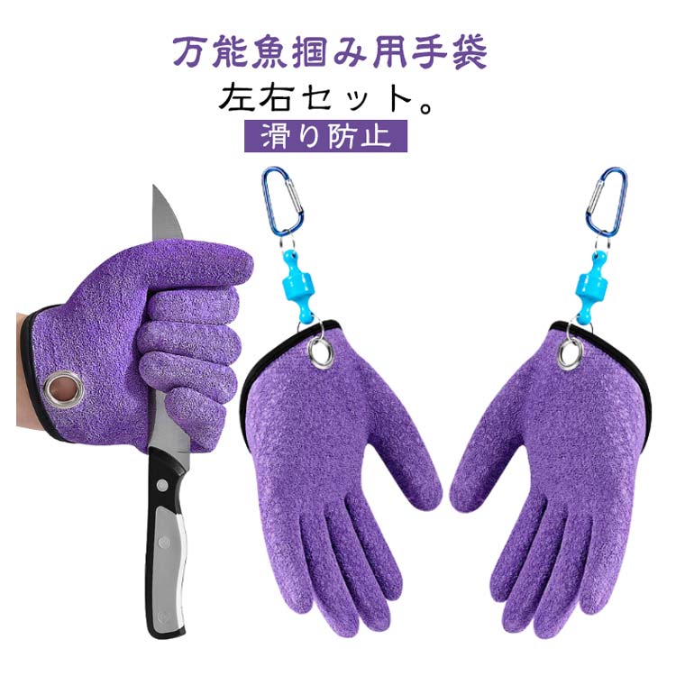 【左右セット】 魚用 手袋 魚グリップ 魚掴み用 両手セット マグネットリリーサー 磁石 滑り防止 カラビナ付き ロータイプ 魚 グローブ 手袋 魚臭 防止 防刃 フィッシンググローブ 耐切創手袋 料理手袋 送料無料 パープル