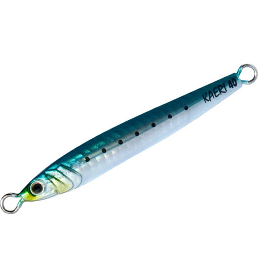 アンドビート カエリ ■ウェイト:40g★カタクチイワシの動きを再現し、微動だにしない水平フォールを実現したメタルジグ。 ジャーク時はウォブリングしながら左右へスライドしてクイックに横姿勢へと移行します。 その無駄のない動きはまさに逃げ惑うカタクチイワシ。ジャーク後のフォールではカエリ独特のバックスライドしない水平姿勢でフォール。これがターゲットの目には弱った食べごろのカタクチイワシに映ります。 スレ切って過度なアクションを即座に見切ってしまうターゲットにはこの水平フォールがとても効果的です。 ヒラマサ、ブリをはじめ、カンパチや大型の根魚と種々様々な魚へ対応してくれます。狙いのレンジでゆっくり大きくシャクって見せたのち、水平フォールで誘ってください。