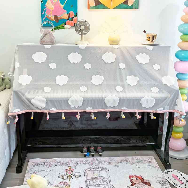 おしゃれ ピアノ カバー アップライト 防塵 保護 装飾布 軽量 薄手 シアー 白 雲柄 ポンポン付き 通気性 家具 テーブルクロス スクエア 洗濯可能