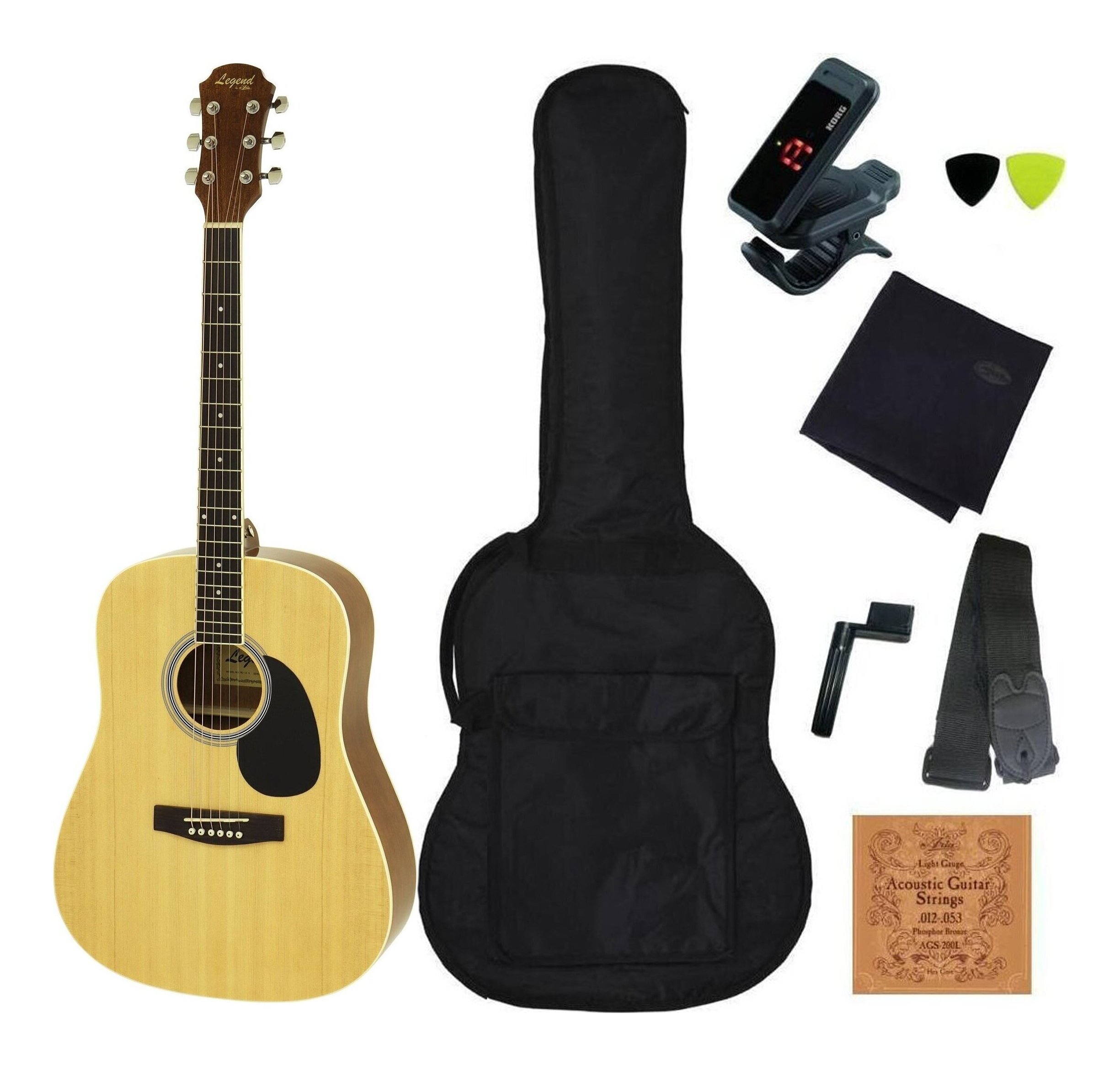 ※画像は撮影用商品のため、お届けの際の商品とは異なります。こちらの商品は一部の地域*を除き送料無料(送料込)です。*離島地域・北海道・沖縄へのお届けは別途、送料が必要になりますので、ご注文の前にご連絡下さい。送料をお知らせいたします。★セット内容★ギター本体:Legend FG-15ソフトケース:付属品チューナー:KORG pitchclipストラップ:ギターを肩にかける為のものです。クロス:本体を拭く布です。ストリングワインダー:弦を巻く道具です。ピック2枚:弦を弾くものです。消耗品です。スペア弦:弦は定期的に交換しましょう。高いコストパフォーマンスが自慢のレジェンドアコースティック。初めてギターを触る方へはもちろん、気軽に弾けるギターが欲しい方へもお勧めです。SpecificationsTop: SpruceBack&Side: AgatisNeck: CatalpaFingerboard:RosewoodScale: 650mmBridge:RosewoodHardware: Chrome