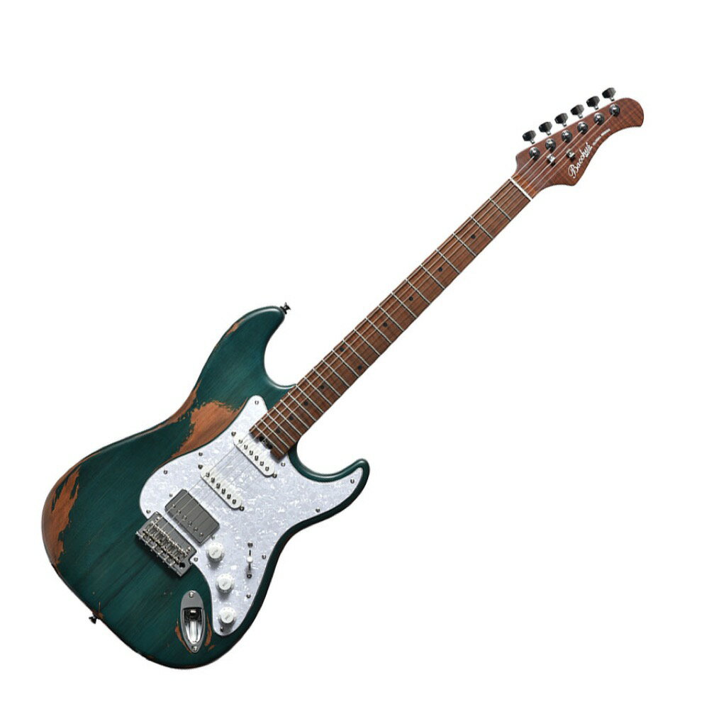 BACCHUS バッカス Global Series BSH-AGED/RSM SMAB-AGED エレキギター。自然な仕上がりを目指したエイジド加工一本一本手作業で行われるボディのエイジド加工により、自然な経年変化を再現しています。一般的なグロスフィニッシュに代わりマットな風合いに仕上げることで、長年引き込んだような風格をその手に感じさせます。※エイジド加工の見た目は個体ごとに異なります。安定感のあるナトーボディボディには重量バランスに優れたナトー材を採用。アルダーやバスウッドにも似たサウンドはクセが少なく、低音から高音までよく響くためジャンルを選ばず活躍できます。ローステッドメイプルネックローステッドメイプルとはメイプルを高温で加熱処理して材の中の水分や油分を揮発させることにより木材を経年変化した状態に人工的に近づけた材のことです。経年変化が進んだ材は歪みやねじれが生じにくくなります。ネックに使用されるとその効果は安定性だけでなくサウンドにも及び、豊かな生鳴りと経年変化したビンテージのようなこなれたトーンを生み出します。一般的に高級機種などで用いられる材ですが、手に取りやすい価格帯に落とし込むことに成功しました。※ロースト加工による色の変化の程度や、メイプルの木目には個体差があります。2点支持Wilkinsonトレモロユニットアームアップ、ダウン両方向に可動域を確保した上で、チューニングの安定性と微妙なニュアンスを両立する2点支持のWilkinson トレモロユニット「Wilkinson WV2-CR」を搭載しています。ロック式ペグペグ裏のホイールを回すとストリングポスト内のロッドが上昇し、弦を挟み込むことでロックされる機構のLocking Tuner(ロック式ペグ)が搭載されています。ストリングポストに対する巻き数を減らすことでチューニングの安定性が上昇するという効果があります。弦を挟み込む機構であるため、弦を多く巻く必要がないことから、弦交換の時間を短縮できたり、テンションのブレを軽減できるというメリットもあります。SSHピックアップレイアウト+コイルタップスイッチSSHピックアップレイアウトで粒立ちの整ったクリーントーンから、パワーあるオーバードライブサウンドまでジャンルを問わず幅広く音作りをすることができます。更にコイルタップスイッチを搭載し、トーンノブをプルアップすることによりリアポジションではシングルコイルピックアップの様なきらびやかなサウンドも出力可能です。【SPEC】Body:NyatohNeck:Roasted MapleFingerboard Radius:Roasted MapleNut:Graphtech TUSQ XLBridge:Wilkinson WV2-CRMachineheads:Locking TunerFret:Nickel SilverPickup:Original S-S-H setControl:1Vol,2Tone(Pull up= Coil Tap switch),5way PU selectorScale:648mm(25.5inch)Fingerboard Radius:305RWidth at Nut:42.0mmFinish:Polyurethane or PolyesterAccessories:ギグバッグ、保証書、アーム、レンチColor:SMAB-AGED