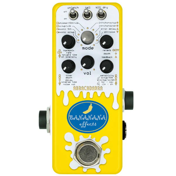 BANANANA effects バナナナエフェクツ/ABRACADABRA CRAZY REVERB リバーブ"Mode''コントロールノブで切り替え可能な8種類の残響モード各モードで効果の異なる4つのパラメーターコントロールサイズ:W39mm D93mm H45mm(突起含む)入力インピーダンス:1MΩ バイパス方法:バッファードバイパス対応電源:9VDC センターマイナス 電池使用不可 消費電流量:約60mA
