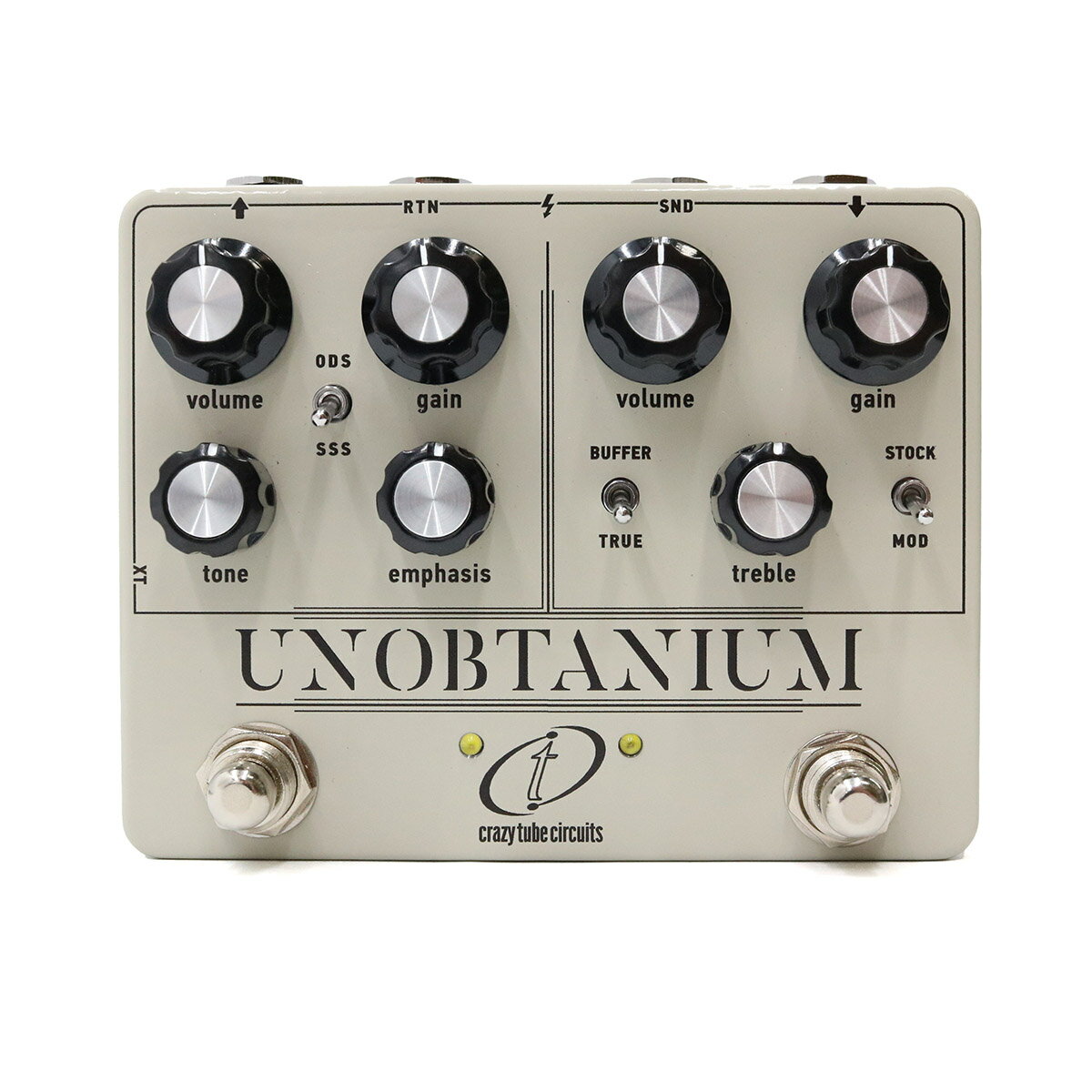 Crazy Tube Circuits Unobtanium オーバードライブ ダンブルアンプのサウンドを再現するオーバードライブ・プリアンプの決定版! Crazy Tube Circuits Unobtanium オーバードライブ は、ナチュラルでレスポンスの良いサウンドが特徴的なギターアンプ「Dumble」と、オーバードライブの名機として知られるKLONオーバードライブを1台に集約した 2 in 1ペダルです。左側のDumbleセクションは、ODS / SSSの2種類のアンプサウンドを設定することができます。ODSでは歌うようなスウィートで美しいドライブサウンドを、SSSではチューブアンプのようなファットでコンプレッションのある美しいクリアーなトーンを奏でることができます。右側のオーバードライブセクションは、メインのオーバードライブとしてもそのポテンシャルを存分に発揮します。また本機のアンプセクションの前に位置することで、アンプセクションをオーバードライブやブースターでプッシュした音作りが可能です。2つのセクションの間にはインサートが設けられています。他のべダルを接続したり、スイッチャーを用いることで2つのセクションを個別に使用することもできます。特徴(右側)・トランスペアレントなブーストから高いヘッドルームのオーバードライブまで調節可能です。・トレブルコントロールは高音域をブーストまたはカットするアクティブ回路で構成されています。・全体の出力を設定するボリュームノブは高いブーストレベルまで設定可能です。・トグルスイッチでオリジナルのバッファーバイパス、またはトゥルーバイパスを選択可能です。・トグルスイッチでストッククリッピング、またはエンハンスドゲインとなるMODクリッピングを選択可能です。Gainコントロールと組み合わせてローゲインサウンドもハイゲインも自在に操ることができます。特徴(左側)・Gain : クリーンから甘く歌うオーバードライブまで調節します。・Emphasis : プレゼンスとボトムエンドのレスポンスをコントロールするためのプリドライブEQです。・Tone : ポストオーバードライブの高音域を調節します。・Volume : 全体の出力を調節します。バイパスされたボリュームに合わせたり、クリーンブーストまたはプリアンプとして使用可能です。・Mode : トグルスイッチは下記の異なる”Dスタイルオーバードライブ回路”を選択可能です。 SSS : 自然なコンプレッションを備えたクリーンで透明なオーバードライブ ODS : 中周波数と倍音を強化したハイゲインオーバードライブ※XTスイッチを用いることで、外部からアンプのボイシングを選択が可能です。※本体内部のトリムによりEQのボイシングとブーストレベルを調節可能です。※ 本機はDC9Vを内部でDC18Vに昇圧されています。DC9V以外のアダプターを接続しますと破損しますのでご注意下さい。 5