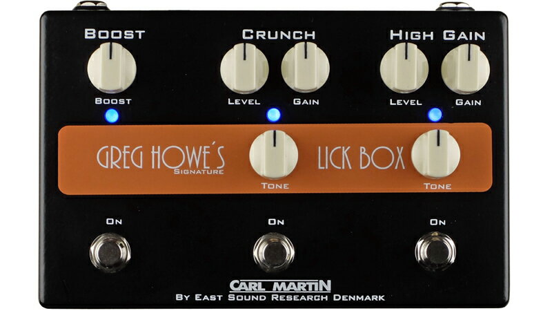 トピックスショッピングクレジット分割48回払いまで金利手数料0%!期間限定 2025年11月30日まで30,000円(税込)以上のお買い物が対象となります。本キャンペーンはクレジットカードでのお支払いは対象外となります。詳しくはお問い合わせください。アイテム説明グレッグ・ハウお得意のハイゲインサウンドとクランチサウンドを1つのペダルにまとめたCarl Martin GREG HOWE'S LICK BOXデンマークが世界に誇るアナログペダルエフェクトの老舗ブランド、Carl Martin(カールマーチン)。欧州のプロフェッショナルを中心に愛用者も多く、サウンドにこだわる日本のギタリストにも好評を博しています。評価の高いオーバードライブ各製品の中でも特に人気が高いPLEXITONEは、プロギタリストのグレッグ・ハウの大のお気に入りで、あらゆるジャンルでも使い込んでいます。今回はそのPLEXITONEを基にグレッグがさらに使いやすい仕様をCarl Martin社にリクエストして完成しました。PLEXITONEはハイゲインとクランチの2つのオーバードライブを搭載し、切り替えて使う仕様でしたが、今回登場するLICK BOXではこの2つのオーバードライブの独立したオン/オフが可能。もちろんPLEXITONE同様にクリーンブースターも内蔵されています。Greg Howe's Lick Boxは、グレッグ・ハウお得意のハイゲインサウンドとクランチサウンドを1つのペダルにまとめました。見た目はグレッグも愛用するPlexiIToneと変わらないように見えますが、グレッグの好みに合わせてチューニングされています。ハイゲイン・チャンネルはより豊かなボトムとカラッとした高音域、そしてクランチ・チャンネルは少しコンプレッションがかかったミッドレンジに特徴があります。もちろん他のペダルでも好評の+12dBクリーンブースターも装備されています。さらに他のペダルと大きく違う仕様として、両チャンネルの同時使用が可能だということ。組み合わせやノブの位置により、そのサウンドとゲインは無限大です。各チャンネルには独立してそれぞれ、GAIN、LEVEL、TONEノブを装備。クリーンブースターにはBOOSTノブが装備されています。なお電源は新たに開発されたDC/DCコンバーターを搭載することにより、9Vの電源仕様ながら内部では±12Vで動作しています。これにより充分なヘッドルームを得られます。*ACアダプターは付属していません。*エフェクター筐体内に電池ボックスが無いため、アダプターのみでの動作。<3Stomps, 1Box>Lick Boxは一見するとProシリーズのPlexiToneと似た仕様になっています。サウンドもさることながら、決定的に違うのはハイゲイン・チャンネルとクランチ・チャンネルがセレクトではなく、それぞれがON/OFFになっているところです。さらに各ドライブチャンネルにはトーンコントロールもついているため、異なるトーンコントロール設定ができます。さらにHot Drive'n Boostをはじめ、PlexiToneやAC-Tone、DC Driveなどに搭載されているクリーンブーストも装備。ハイゲインOD、クランチOD、ブースターと3つのストンプが1つの筐体に収められています。1台3役ですが、歪みに関してこの1台で完結できてしまうほどです。<グレッグ・ハウ PlexiToneコメント>Carl Martin の PlexiTone には文字通りブッ飛んだよ!ありとあらゆるアンプのクリーンチャンネルに、あるいは1ボリュームのアンプにブチ込んで試してみたけど、どのアンプからでも望み通りの音が出せるんだ。そう、出したい音はすべてね!手に入れてからもうかれこれ数ヶ月経つけど、今となっては俺の持ってる他のどのハイエンド・ペダルたちにも負けない重要な機材になっているよ。それと最近気づいたんだけど、このトーンはどんなジャンルの音楽にもフィットするね。「○○なジャンル向け」といったペダルが多い中で、コイツはものすごく多用途に使えるんだ。微妙な味付け程度のブーストから引き締まったクランチトーン、ゴリゴリの歪みまで…どんな音色でもウォームなんだ。たとえどんなにハイゲインでも暖かみを失わないんだから、たまんないよ。●入力インピーダンス:1MΩ●出力インピーダンス:200Ω●S/N比:54dB●最大ゲイン(ハイゲインチャンネル):+89dB●最大ゲイン(クランチチャンネル):+60dB●最大ブーストゲイン:+12dB●電源仕様:ACアダプター9VDC/150mAセンターマイナス(乾電池は使用できません)●最大消費電流:100mA●外形寸法:188W x 123D x 56H mm●本体重量:700g納期について売却時は迅速に商品情報の削除を心掛けておりますが、ショッピングページの更新までにタイムラグが生じ、ご注文のタイミングによっては商品のご用意ができない場合がございます。あらかじめご了承くださいますようお願い申し上げます。あす楽対象商品以外、納期のご確認はご注文前に「商品についての問合わせ」よりお問い合わせください。