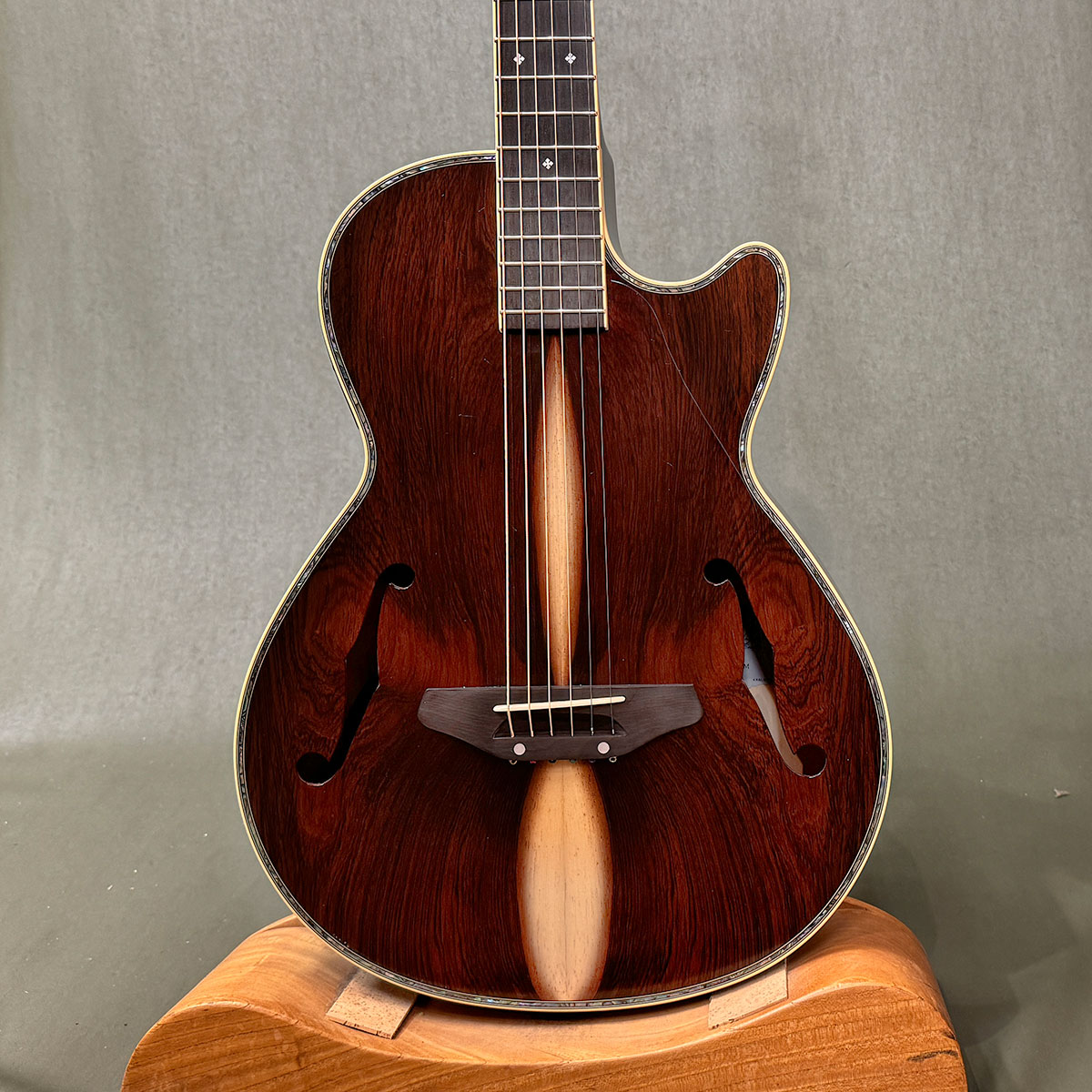2025/7月頃入荷予定 10本限定でKYFシリーズの最高峰、ハカランダトップを販売致します。 サップの混ざった特殊な木目の2ピース材を使用します。ヘッド天神にもハカランダを用い、糸巻きはジリコーテつまみのGotoh製 SGV510-ZS-CKを採用します。 ※画像は前回入荷の個体です。 まるでレスポールの様な奥行! ヤイリギターの特殊エレアコKYFシリーズ。バイオリンやジャズギターのようなF字型のサウンドホールはデザイン性も兼ねていますが、ステージでのハウリングを防ぐために考案されたもので、ボディー内部の共鳴もできる限り抑えられた構造になっております。自宅での音出しにも最適で、サイレントギターとしてもおススメです。 職人たちが1本1本を丁寧に仕上げるヤイリギターを、末永くご使用いただく為に新品のヤイリギターにはすべて「永久保証」が付属します。 ◇ヤイリギターについて詳しく知りたい方は当店専門スタッフがお応えいたします。 お気軽にお問い合わせください。◇ 【仕様】 ・表板:ハカランダ ・側板:プライウッド ・裏板:プライウッド ・ネック:マホガニー ・フィンガーボード:エボニー ・ブリッヂ:エボニー ・弦長:645mm ・ナット幅:42mm ・永久保証付き ・専用ハードケース付 ヤイリギターではセミオーダーや完全オーダーを1本単位で取り扱います。世界に1本だけの特別なギターを作ることができます。漠然としたアイデアしかない場合でも専門スタッフにご相談ください。 特注担当:直井 TEL 03-3293-7771