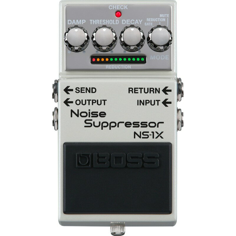 BOSS 独自のMDP 技術により完成した次世代のノイズ・リダクションと超高速ゲートNS-1X は、BOSS 独自のデジタル信号処理技術MDP を駆使した多元的かつ高速な信号処理により、原音のアタックやサスティン、弾き心地を損なわずにノイズを取り除く次世代のノイズ・サプレッサーです。極めて自然にノイズを除去する汎用性の高いREDUCTION モードと、圧倒的な速さでゲートを動作させ、ハイゲイン・サウンドによるリフ・プレイやタッピング、スウィープ などテクニカルな奏法に最適な効果をもたらすGATE モードを搭載。NS-1X は悩ましいノイズの問題を取り除くだけでなく、新しい演奏表現をギタリスト/ベーシストへもたらす高度なノイズ・サプレッサーです。・BOSS 独自のMDP 技術を駆使した次世代のノイズ・サプレッサー・高度な信号処理により、ギター本来の音色や弾き心地への影響なくノイズを抑制・3 つのノブで目的にあった設定が可能・自然な弾き心地のままノイズを抑制する汎用性の高いREDUCTION モード・ハイゲイン・サウンドでのリフやテクニカルな奏法に最適な、極めて高速なゲート処理を実現するGATE モード・全信号のミュートとノイズ・リダクションの使い分けが可能なMUTE モード・ノイズ・リダクションのかかり具合を視覚的に表示するインジケーター・歪みペダルのノイズ抑制に最適なSEND/RETURN 端子・ギターやベース、その他電子楽器での使用が可能・ 他ペダルへの電源供給(9V) が可能なDC OUT を搭載・安心の長期5 年保証次世代のノイズ・サプレッサーノイズ・サプレッサーは、一定以下の入力信号を遮断することで、休符時などの楽器が鳴っていない時に目立つノイズを除去するエフェクトです。快適な演奏環境を提供する一方、入力される信号に対し常にゲートの開け閉めを繰り返すため、しばしば原音のアタックが失われたり、サスティンが不自然になったりすることも少なくありません。NS-1XはBOSS独自のMDPテクノロジーを駆使して開発された高度なノイズ・サプレッサーです。入力信号のレベル、立ち上がりや減衰の時間経過による変化など、膨大な情報を最新のデジタル技術を用いて処理することで、レスポンスを損なうことなく高速ノイズ除去を実現します。理想的なノイズ・リダクションを実現NS-1XはREDUCTION、GATE、MUTEモードを搭載しています。プレイ・スタイルや好みに応じて選択することで、適切な効果を得ることが可能です。REDUCTION—汎用性の高いモードです。どのようなサウンド、奏法でも弾き心地はそのままに、不要なノイズのみを自然に取り除きます。出力の弱いピックアップでも、音が不自然に揺れることなくロング・ノートを演奏可能です。GATE—超高速でゲートの開閉をコントロールするモードです。極めて鋭いアタックを保ちつつ、演奏を止めれば即座に静寂を得ることが可能です。深く歪ませたサウンドによるキレを重視したリフ・プレイや、輪郭あるアタックが必要なスラップ、タッピングを駆使した奏法など、モダンなスタイルに最適です。MUTE—エフェクトをオンにしている間、全ての信号を遮断するモードです。エフェクト・バイパス時はREDUCTIONおよびGATEモードでノイズ・リダクション効果が得られます。迅速かつ簡単な操作NS-1Xは3つのパラメーターを搭載しています。使用機材、演奏スタイルや環境に合わせて設定を行うことで、原音のキャラクターや弾き心地を損なうことなくノイズを除去することが可能です。また、リダクション・インジケーターが除去したノイズ・レベルをリアルタイムで表示するため、実際のノイズ・リダクションのかかり具合を細かく視認することもできます。THRESHOLD—ノイズ・リダクションを開始する信号レベルを調節するノブです。REDUCTIONモードでは、左に回し切った状態から設定を開始し、ノイズが聞こえなくなるまでノブを右に回します。GATEモードを用いる際は、右に回し切った状態から、ピッキングした際に音が出るようになるまで左に回していくと、鋭いアタックとタイトなリリースを得ることが可能です。DECAY—ノイズ・リダクションが開始する際の音の減衰時間を調節するノブです。右に回すほど減衰時間が長くなります。始めはノブを左に回し切り、音の切れぎわが不自然な場合は徐々に右へ回していくことでスムーズな減衰へと調整可能です。DAMP—ノイズ・リダクションによるノイズの減衰量を調節するノブです。右に回すと演奏時と無音時の差が明確に、左に回すとなめらかになります。メリハリのある無音時間を作りたいときは右に、ピッキングニュアンスを活かした繊細な演奏をする際は左に回すと効果的です。スマートにノイズを抑制NS-1XはINPUTにギターの信号が入力されると演奏状態を解析。この検出を元に、瞬時にOUTPUTに配置されているゲートの開閉を指示し、ノイズを適切に抑制します。歪みペダルのノイズを抑制したい場合は、ペダルをNS-1XのSEND/RETURNに取り込みます。検出に好ましいクリーン・サウンドをINPUT段