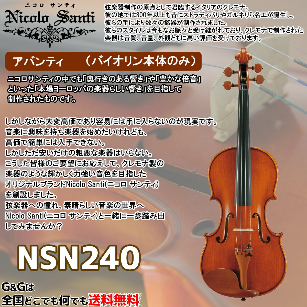 トピックスショッピングクレジット分割48回払いまで金利手数料0%!期間限定 2026年2月28日まで30,000円(税込)以上のお買い物が対象となります。本キャンペーンはクレジットカードでのお支払いは対象外となります。詳しくはお問い合わせください。アイテム説明弦楽器制作の原点として君臨するイタリアのクレモナ。彼の地では300年以上も昔にストラディバリやガルネリら名工が誕生し、彼らの手により数々の銘器が制作されました。彼らのスタイルは今もなお脈々と受け継がれており、クレモナで制作された楽器は音質、音量、外観ともに高い評価を受けております。しかしながら大変高価であり容易には手に入らないのが現実です。音楽に興味を持ち楽器を始めたいけれども、高価で簡単には入手できない。しかしただ安いだけの粗悪な楽器はいらない。こうした皆様のご要望にお応えして、クレモナ製の楽器のような輝かしく力強い音色を目指したオリジナルブランドNicolo Santi(ニコロ サンティ)を創設しました。弦楽器への憧れ、素晴らしい音楽の世界へNicolo Santi(ニコロ サンティ)と一緒に一歩踏み出してみませんか?■Avantiグレードニコロサンティの中でも「奥行きのある響き」や「豊かな倍音」といった「本場ヨーロッパの楽器らしい響き」を目指して制作されたものです。セット内容も充実させており、より高いクオリティをお求めの方に最適です。スペック■サイズ : 4/4■表板 : ヨーロッパ産スプルース■裏板、側板、ネック : ヨーロッパ産メイプル■指板 : エボニー■糸巻き、あご当て、テールピース : ボックスウッド■弦 : ゴールドブロカット(E)、ドミナント(A、D、G)※サンプル画像になります。実際の木目など異なります。納期について売却時は迅速に商品情報の削除を心掛けておりますが、ショッピングページの更新までにタイムラグが生じ、ご注文のタイミングによっては商品のご用意ができない場合がございます。あらかじめご了承くださいますようお願い申し上げます。最強配送対象商品以外、納期のご確認はご注文前に「商品についての問合わせ」よりお問い合わせください。
