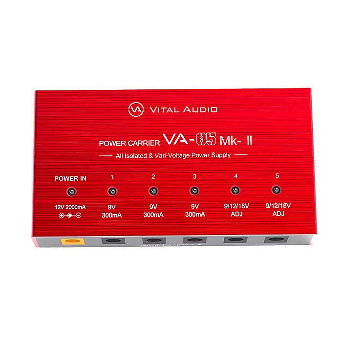 Vital Audio バイタルオーディオ POWER CARRIER VA-05 MkII パワーサプライVITAL AUDIO の POWER CARRIER シリーズは、発売以来、高い性能、サイズ感、優れたコストパフォーマンスによって人気を博し、フラッグシップモデル VA-08 MkII は、 パワーサプライの定番となっています。また、そのコンパクトな設計でエフェクトボード内での省スペース化を実現した VA-05 ADJ は、VA-08 MkII と同じく定番モデルとなりましたが、このたび、さらに安定した電源供給を推し進めるべく、PCBA ボードをリファインし、新たに VA-05 MkII として生まれ変わることとなりました。VA-05 MkII は、前モデル VA-05 ADJ の小型/ 5 ポートという基本仕様はそのままに、各ポートにトランスフォーマーを追加することでアイソレーションを強化。さらに保護回路の見直しにより過負荷時や発熱時の本体保護も強化されています。少数のエフェクターへの電源供給はもちろん、大型ボードへの追加用電源としてもお選びいただけるモデルです。多くのギターリスト・ベーシストの足元を支える相棒となるはずです。【主な特徴】POWER CARRIER シリーズのVA-05 MkIIは、前モデルであるVA-05 ADJ を基にさらに保護回路の見直しを行しました。各ポートにトランスフォーマーを追加することでアイソレーションを強化し、過負荷がかかったときや発熱時に回路を保護することが強化されています。VA-05 MkIIでもPOWER CARRIER シリーズの特徴でもあるアルマイト処理によるブランドカラーの赤と黒が映える2トーンカラーを採用しています。小型ながらもしっかりしたモデルとなっています。・フルアイソレートタイプのエフェクトペダル用パワーサプライ・9V 300mA (Max) ポート x 3・9V 500mA /12V 375mA /18V 250mA 可変ポート x 2*総電流容量は、2000mAです。・アルマイト塗装による鮮やかで高級感のある仕上がり・強化されたショート保護回路により安定した動作環境を実現・リファインされた回路により電力不足や過負荷に対する保護の強化【スペック】・3つの9V供給ポートと2つの(9V/12V/18V)可変ポート・9Vポートは300mA(最大)、可変ポートは500mA(最大)の電流量を確保・強化された全ポートのアイソレーション・スリムでコンパクトな設計でエフェクトボード内の省スペースに配置可能・保護回路の見直しにより安定した動作環境を実現・各出力ポートに装備されたLEDライトによって、動作状態をモニター・アルマイト加工処理による高級感あふれる筐体・DCケーブル (60cm S/L) × 5本同梱・12V 2000mA ACアダプター付属・FCLS(Foldback Current Limiting Circuit)は、電力不足や過負荷に対する究極の保護を提供・外形寸法:111.5 (W) × 60 (D) × 21.3 (H) mm・本体重量:134 g
