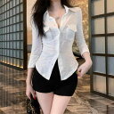 シャツ レディース アメリカンスタイル 甘辛 長袖 POLO襟 ポリエステル ウエストマーク 開襟トップス ブラウス 秋冬 セクシー タイト ホワイト