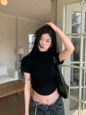 フリル シャーリング トップス レディース 春夏 かわいい アメリカン ホット ガール シック 韓国 プリーツ ハーフ タートルネック 半袖 Tシャツ 女性用 2025 夏 へそ ウエスト トップ
