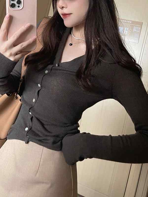 ニット レディース 深灰色 ポロシャツ 長袖 秋冬 配色 カーディガン トップス 通勤スタイル ポリエステル アクリル
