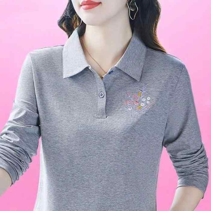 Tシャツ レディース 長袖 ポロシャツ チュニック ゆったり 刺繍 トップス グレー 杏色 ブルー 通勤 ポリエステル 花柄 春