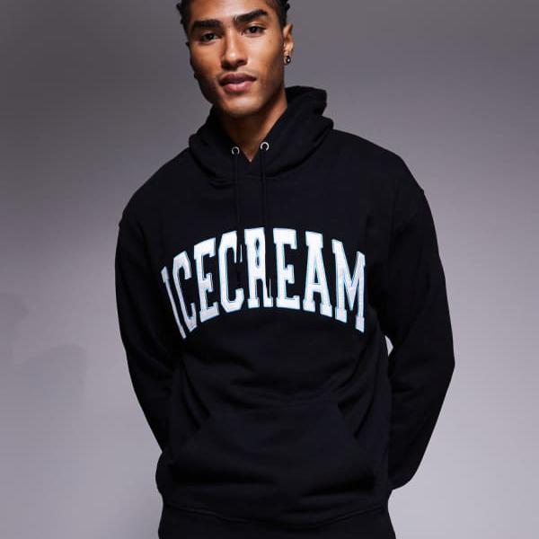 ICECREAM カレッジアップリケプルオーバーパーカー(ブラック) トップス メンズ 男性 インポートブランド 小さいサイズから大きいサイズまで