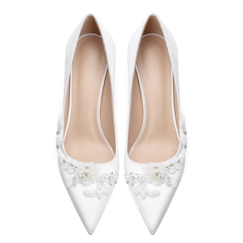 パンプス レディース ポインテッドトゥ ピンヒール ハイヒール 白 無地 スパンコール ラインストーン ビーズ 花柄 サテン パーティー ウエディング ブライダル 結婚式 米白 春夏 秋冬
