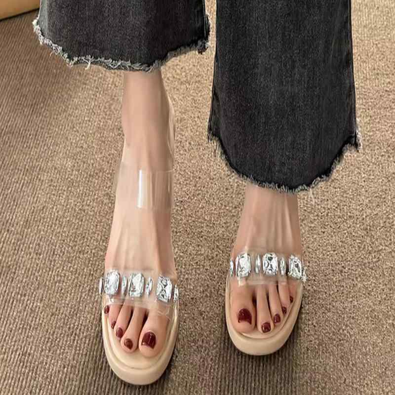 サンダル レディース 水晶 クリア ヒール ミュール スクエアトゥ チャンキーヒール スリッパ つっかけ 外履き 杏色 米白 PVC 通勤