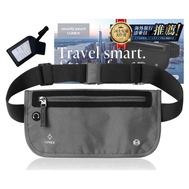【国土交通大臣賞受賞の添乗員 推奨】 スリ対策用セキュリティポーチ [超軽量極薄素材×大きめサイズで収納力UP] スキミング防止機能で盗難リスク軽減 シークレットポーチ ネームタグ【海外渡航600回超の添乗員 推奨】世界中の空港・ホテル・都市を知り尽くした現役のプロ添乗員が600回以上の海外渡航を通じて本当に必要だと感じた機能だけを厳選。 移動時の不便、貴重品の管理、スリやスキミングのリスク、実際に現場で起きるあるあるを徹底的に解消したアイテムです。【幅広い体型にフィットする快適設計】サイズ調整は60~90cmまで対応。ウエストが細い方から男性の体型まで幅広くフィット。特にウエストが細めの女性でもズレにくくしっかり装着できるのが特長です。素材にはスポーツウェアにも使われるライクラ素材を採用。最大5~8倍の伸縮性を誇り体にぴったり沿ってフィット。動いてもズレにくく長時間つけても快適です。【コンパクトなのにしっかり収納】本体は小さめながらもポケットは3つに分かれており貴重品をすっきり整理可能。 カード類を分けて収納できる仕切りポケット付きで取り出しやすさも抜群です。 従来品より横幅を約5cm拡張し収納力がさらにアップ。 それでも薄さはそのままなので着け心地や目立ちにくさは損ないません。 スマホ、パスポート、現金、小物類など、必要なものを無理なく収納でき出し入れもスムーズ。旅行中のストレスを軽減します。【軽くて薄い だから目立たず守れる】わずか170gの超軽量設計。スマホ1台分ほどの軽さで長時間つけていてもストレスフリー。 薄型設計で服の下にしっかり隠れるからスリに狙われにくく大切な貴重品をスマートに守ります。 さらに撥水試験済みの生地を採用。突然の雨や汗にも強く旅先でのアクシデントにも安心。【旅だけではない 日常にも使える万能ポーチ】薄くてコンパクトなデザインだから使えるのは旅行だけではありません。 ジムやフェス、ライブイベント、宿泊施設内の移動など、手ぶらで動きたい場面にぴったり。 さらに斜め掛けにすれば普段使いにも スマホや鍵財布など必要最低限をすっきり収納できちょっとした外出や子どもの送り迎えにも便利です。