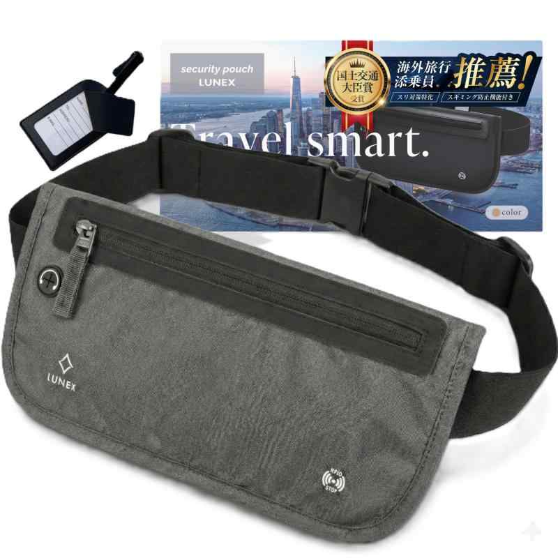 【国土交通大臣賞受賞の添乗員 推奨】 スリ対策用セキュリティポーチ [超軽量極薄素材×大きめサイズで収納力UP] スキミング防止機能で盗難リスク軽減 シークレットポーチ ネームタグ【海外渡航600回超の添乗員 推奨】世界中の空港・ホテル・都市を知り尽くした現役のプロ添乗員が600回以上の海外渡航を通じて本当に必要だと感じた機能だけを厳選。 移動時の不便、貴重品の管理、スリやスキミングのリスク、実際に現場で起きるあるあるを徹底的に解消したアイテムです。【幅広い体型にフィットする快適設計】サイズ調整は60~90cmまで対応。ウエストが細い方から男性の体型まで幅広くフィット。特にウエストが細めの女性でもズレにくくしっかり装着できるのが特長です。素材にはスポーツウェアにも使われるライクラ素材を採用。最大5~8倍の伸縮性を誇り体にぴったり沿ってフィット。動いてもズレにくく長時間つけても快適です。【コンパクトなのにしっかり収納】本体は小さめながらもポケットは3つに分かれており貴重品をすっきり整理可能。 カード類を分けて収納できる仕切りポケット付きで取り出しやすさも抜群です。 従来品より横幅を約5cm拡張し収納力がさらにアップ。 それでも薄さはそのままなので着け心地や目立ちにくさは損ないません。 スマホ、パスポート、現金、小物類など、必要なものを無理なく収納でき出し入れもスムーズ。旅行中のストレスを軽減します。【軽くて薄い だから目立たず守れる】わずか170gの超軽量設計。スマホ1台分ほどの軽さで長時間つけていてもストレスフリー。 薄型設計で服の下にしっかり隠れるからスリに狙われにくく大切な貴重品をスマートに守ります。 さらに撥水試験済みの生地を採用。突然の雨や汗にも強く旅先でのアクシデントにも安心。【旅だけではない 日常にも使える万能ポーチ】薄くてコンパクトなデザインだから使えるのは旅行だけではありません。 ジムやフェス、ライブイベント、宿泊施設内の移動など、手ぶらで動きたい場面にぴったり。 さらに斜め掛けにすれば普段使いにも スマホや鍵財布など必要最低限をすっきり収納できちょっとした外出や子どもの送り迎えにも便利です。