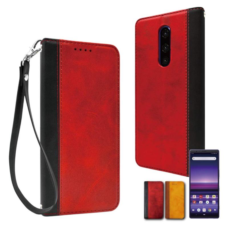 シズカウィル Xperia 1 ケース カバー 手帳型 本革調 レザーケース ボルドーレッド×ブラック 1個入り