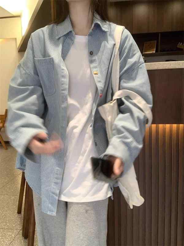 シャツ レディース 長袖 デニムシャツ ブルー ストライプ柄 切り替え デザイン襟 翻襟 秋冬 カジュアル ヴィンテージ風・主な素材: ポリエステル, 綿・柄: ストライプ・スタイル: ボタン, ポケット・袖丈: 長袖・フィット: ゆったり・ネックライン: シャツ襟・袖のタイプ: レギュラー袖・カラー: ブルーストライプ・サイズ: S, M, L, XL, XXL・スタイル: レトロ・フロント: シングルブレスト